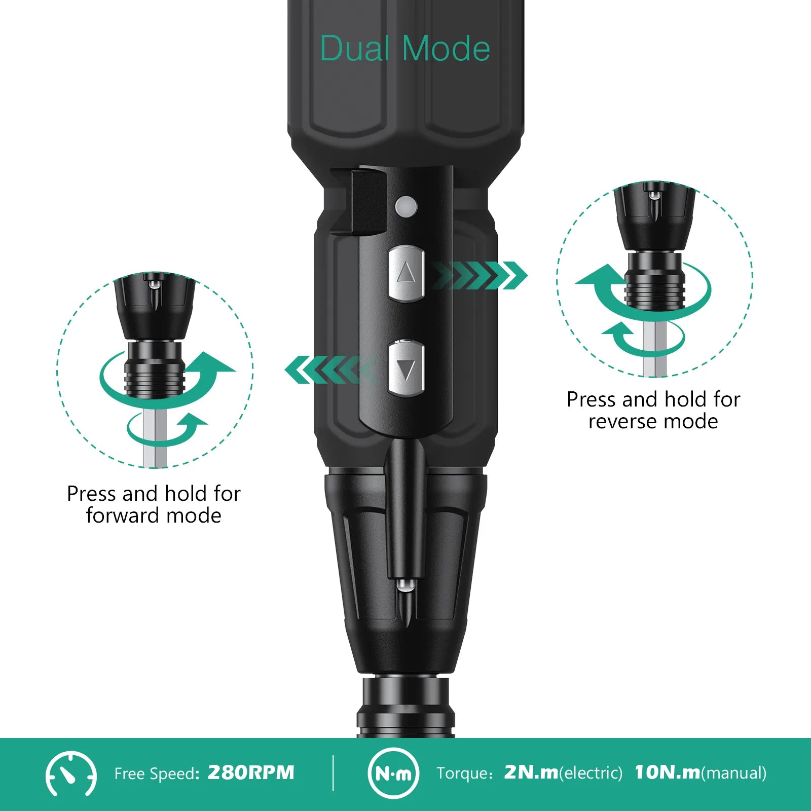 Der elektrische Schraubendreher™ kann sowohl elektrisch als auch manuell verwendet werden. Er bietet ein maximales Drehmoment von bis zu 2 Nm im elektrischen Modus und bis zu 10 Nm im manuellen Modus.