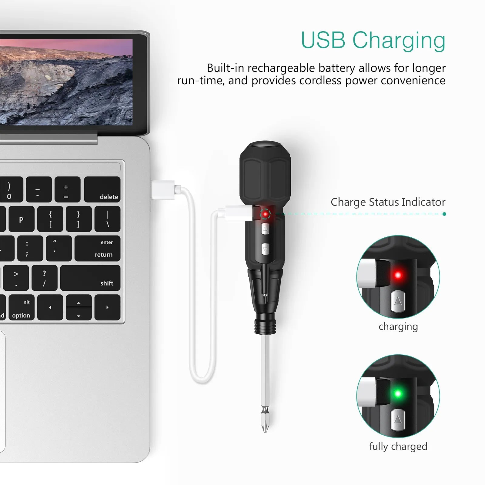 Sie können an unterschiedlichen Orten arbeiten, auch ohne Zugang zu Stromquellen. Der Schraubendreher lässt sich über USB aufladen und kann nach 1 Stunde Ladezeit 80 Minuten ohne Unterbrechung arbeiten.