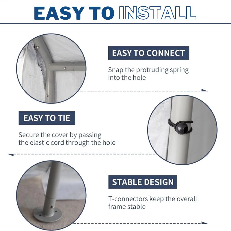 Der gesamte Rahmen unseres tragbaren Schuppens besteht aus einem rostbeständigen, pulverbeschichteten Stahlrahmen, der Abblättern, Abblättern, Rost und Korrosion verhindert. Die Säulen mit einem Durchmesser von 1,5 Zoll und einer Dicke von 1,2 mm sorgen dafür, dass die Struktur stabil bleibt und langanhaltenden Schutz für Ihre Lagerbedürfnisse im Freien bietet.