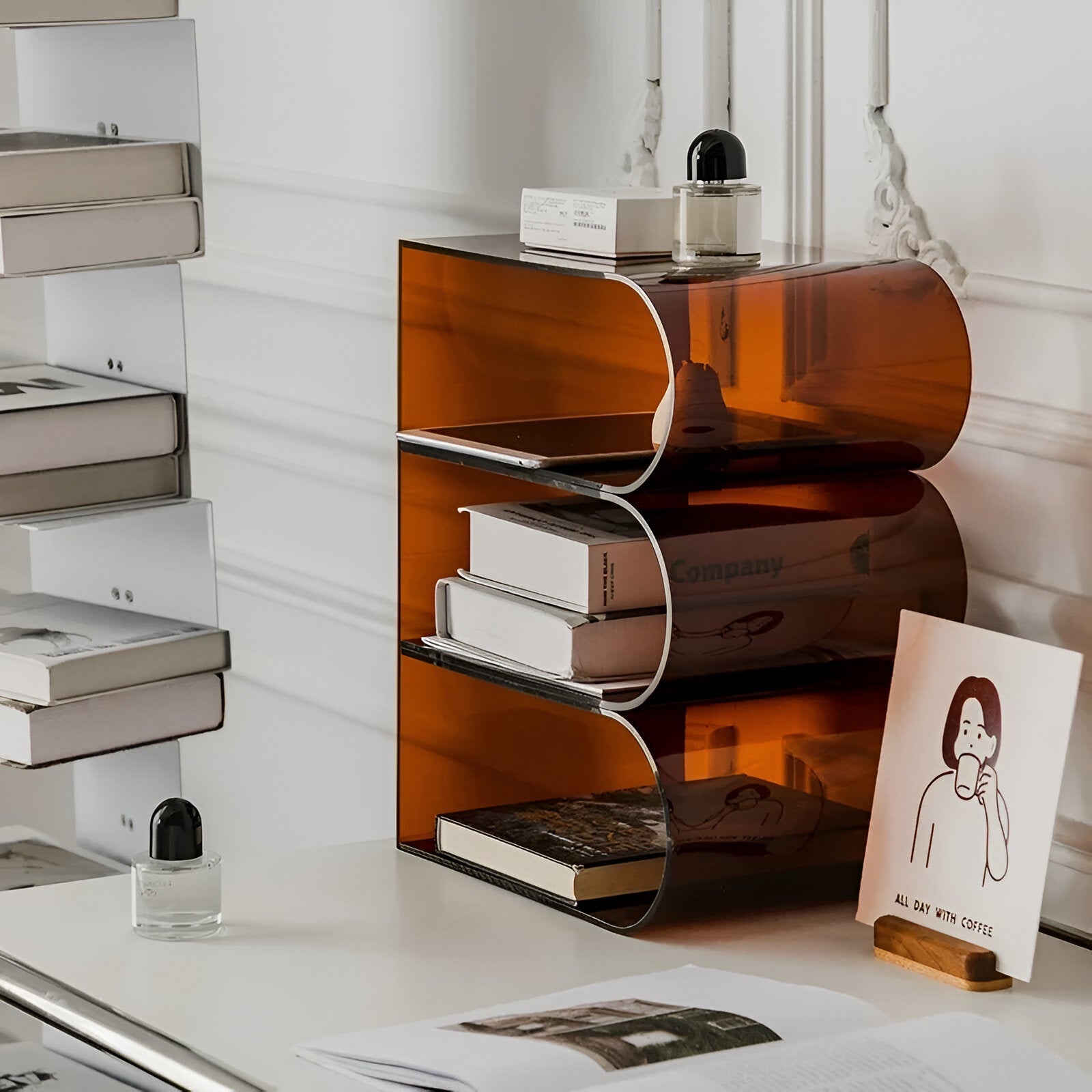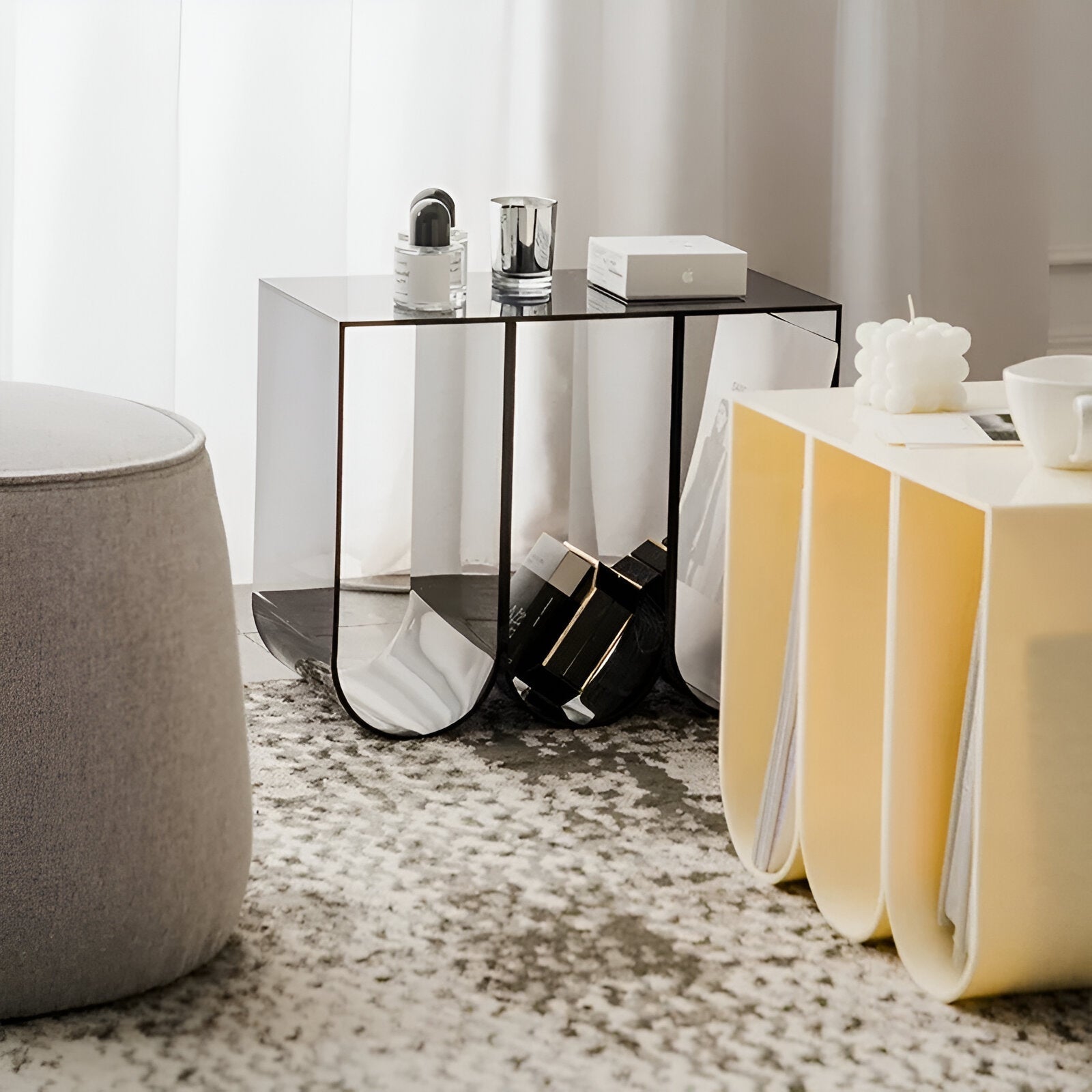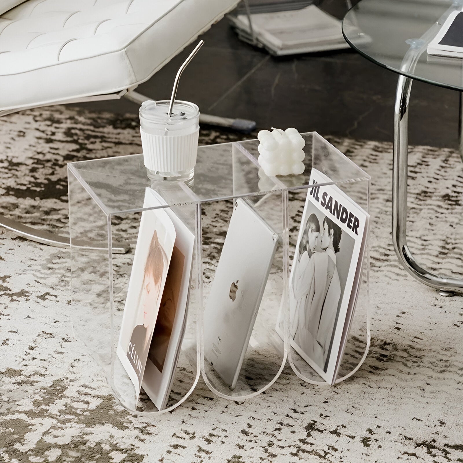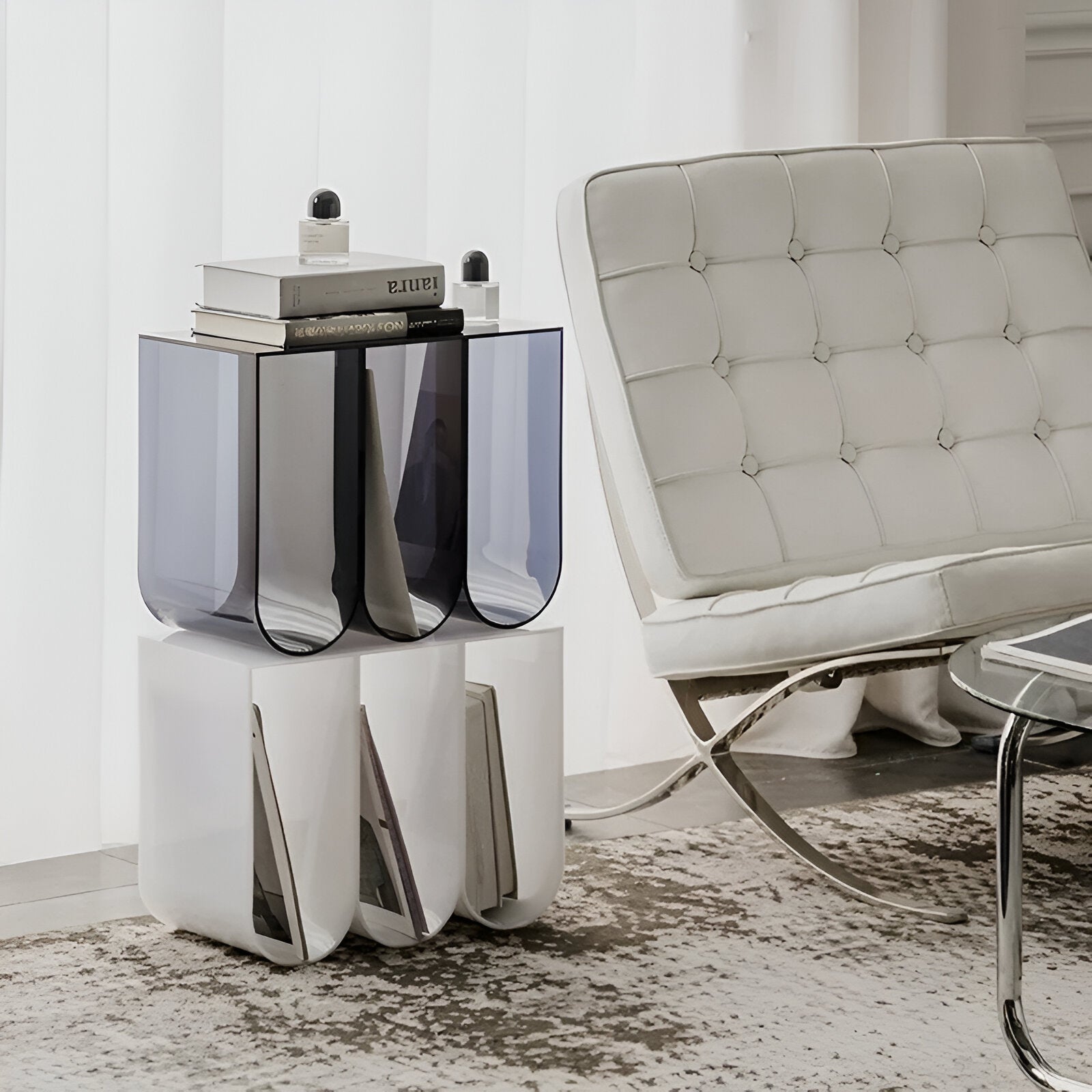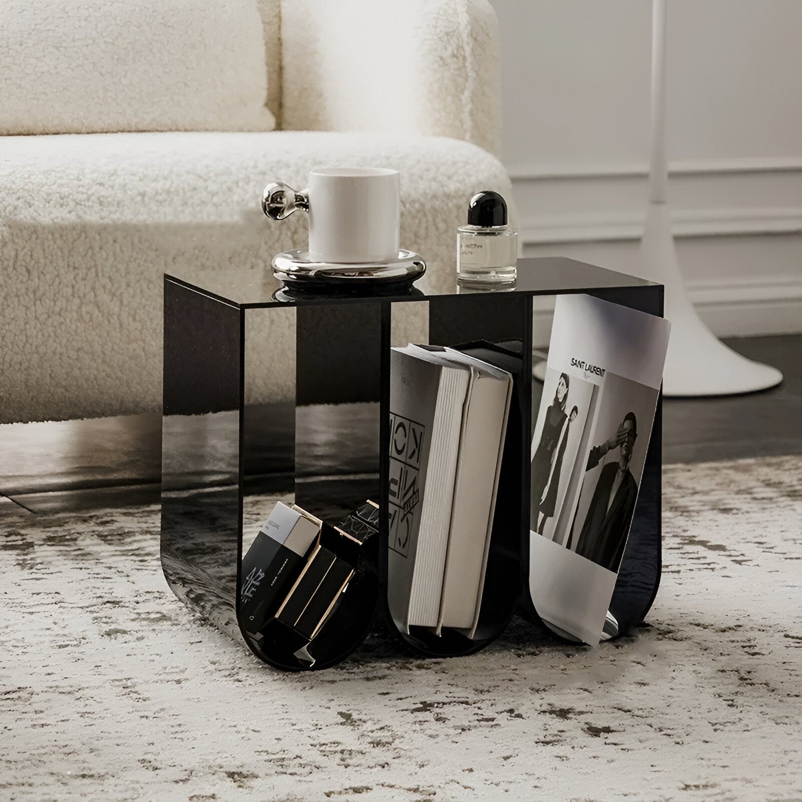 Fügen Sie Ihrem Wohnzimmer mit diesem abstrakten Acrylkaffee Tisch einen Hauch von Verspieltheit hinzu. Dieses einzigartige Stück dient gleichzeitig als Bücherregal und Zeitschriftenständer und bietet sowohl Stauraum als auch Stil. Perfekt für das moderne Zuhause, wird dieses vielseitige Stück Ihrem Dekor ein verspieltes und dennoch funktionales Element hinzufügen.