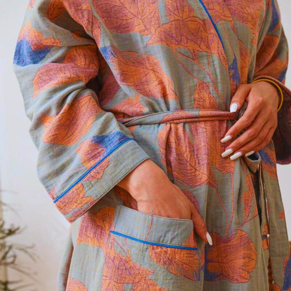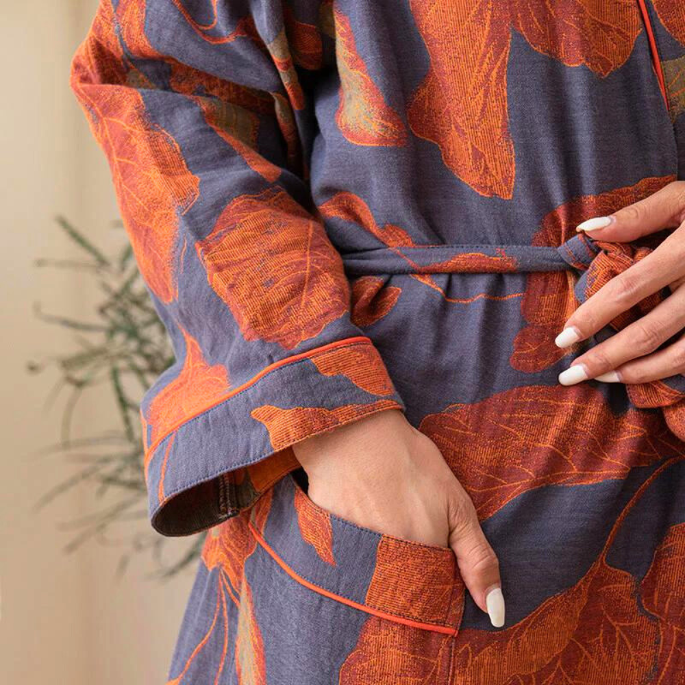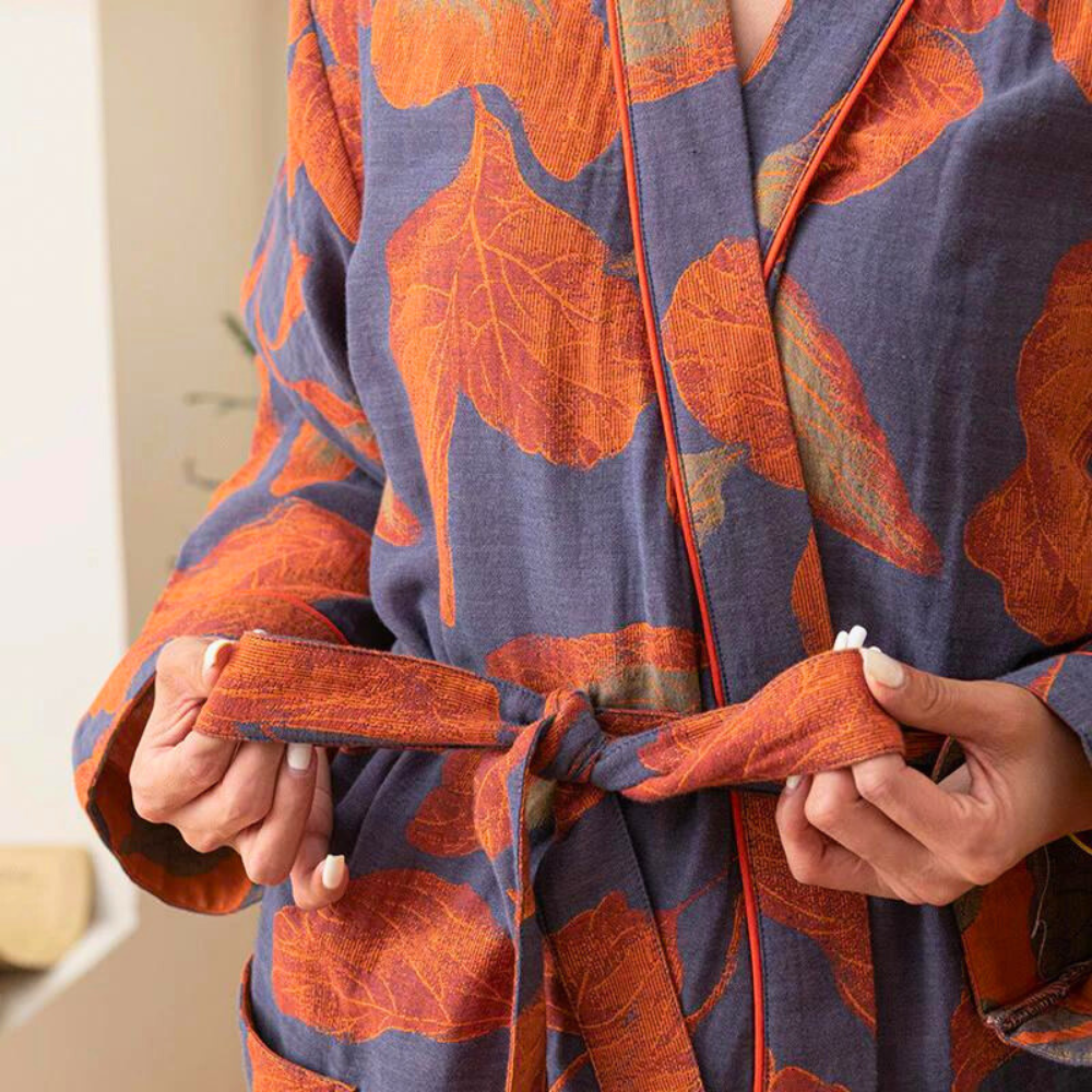 Gönnen Sie sich einen Moment absoluter Entspannung mit dem Bademantel Baumwolle - Natürliche Weichheit - Alice. Entworfen für moderne Frauen, die Wert auf Komfort legen, umhüllt Sie dieser Baumwollmantel mit großen Blättern in unvergleichlicher Weichheit und vermittelt ein Gefühl von natürlichem Wohlbefinden.