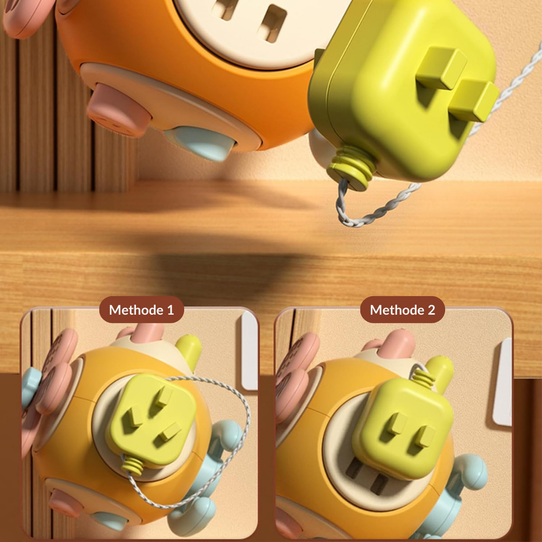 Mit drehbaren Bauteilen und drückbaren Knöpfen hilft er, die Feinmotorik und die Hand-Augen-Koordination zu entwickeln.
