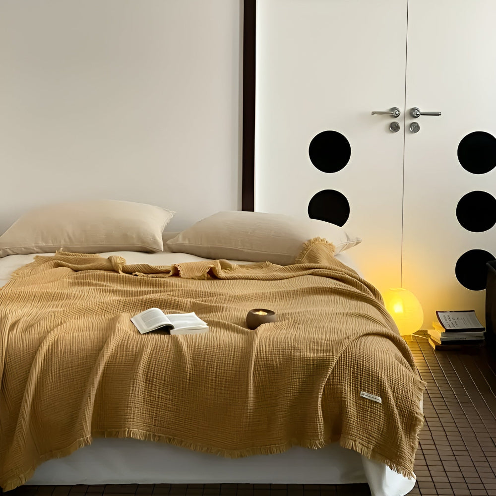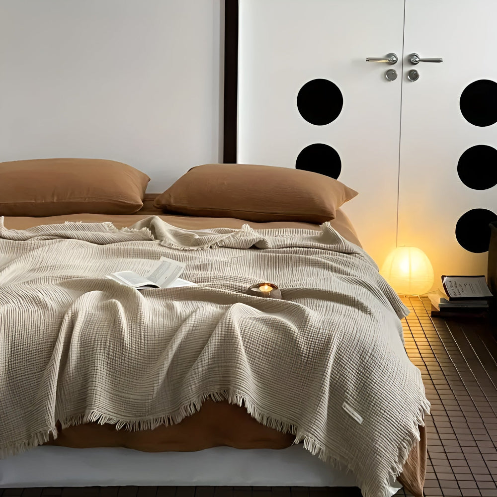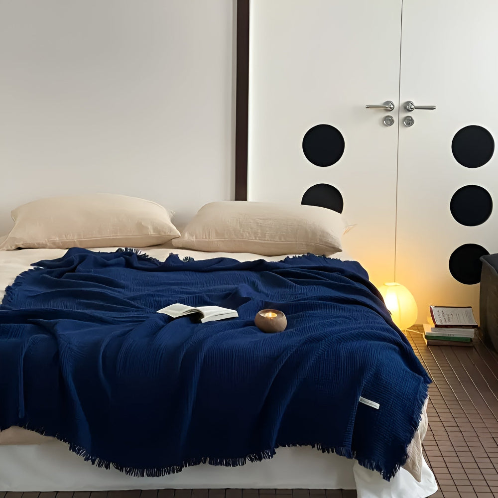Genießen Sie zeitlosen Komfort mit dieser Baumwoll-Crinkle-Fransen-Decke, die aus 100% Baumwolle mit einer weichen Crinkle-Textur gefertigt ist. Entwickelt für Stil und Funktionalität, ist sie perfekt, um Ihre Wohnkultur zu bereichern oder Sie während der Freizeit, auf Reisen oder bei Nickerchen gemütlich zu halten.