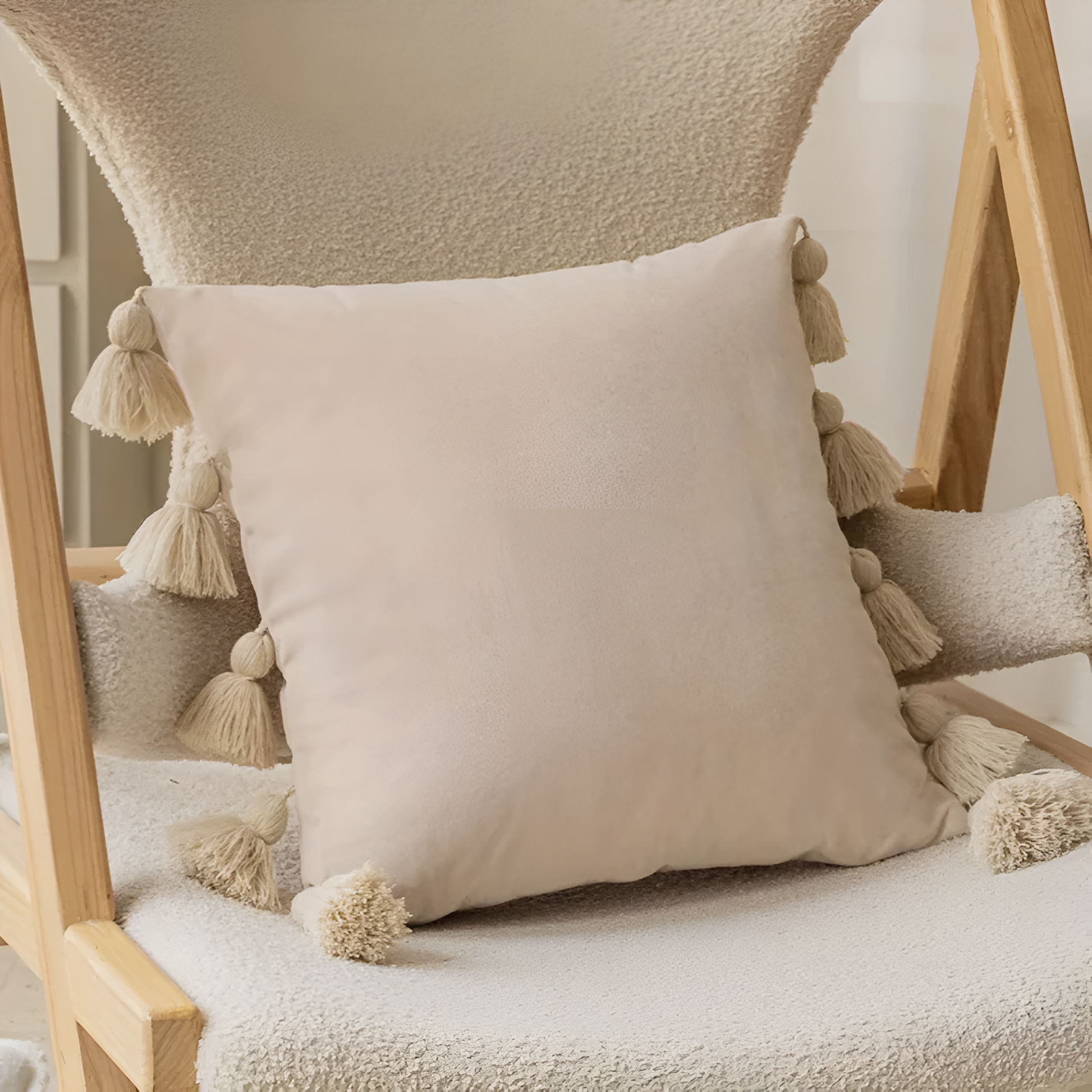 Verleihen Sie Ihrem Raum mit diesem Pom-Pom-Kissenbezug boho-chice Charme. Aus luxuriösem, weichem Samt gefertigt und mit 10 handgefertigten Quasten verziert, ist er sowohl verspielt als auch elegant. Perfekt für Sofas, Betten oder Autos, ergänzt das einfarbige Design jede Einrichtung.