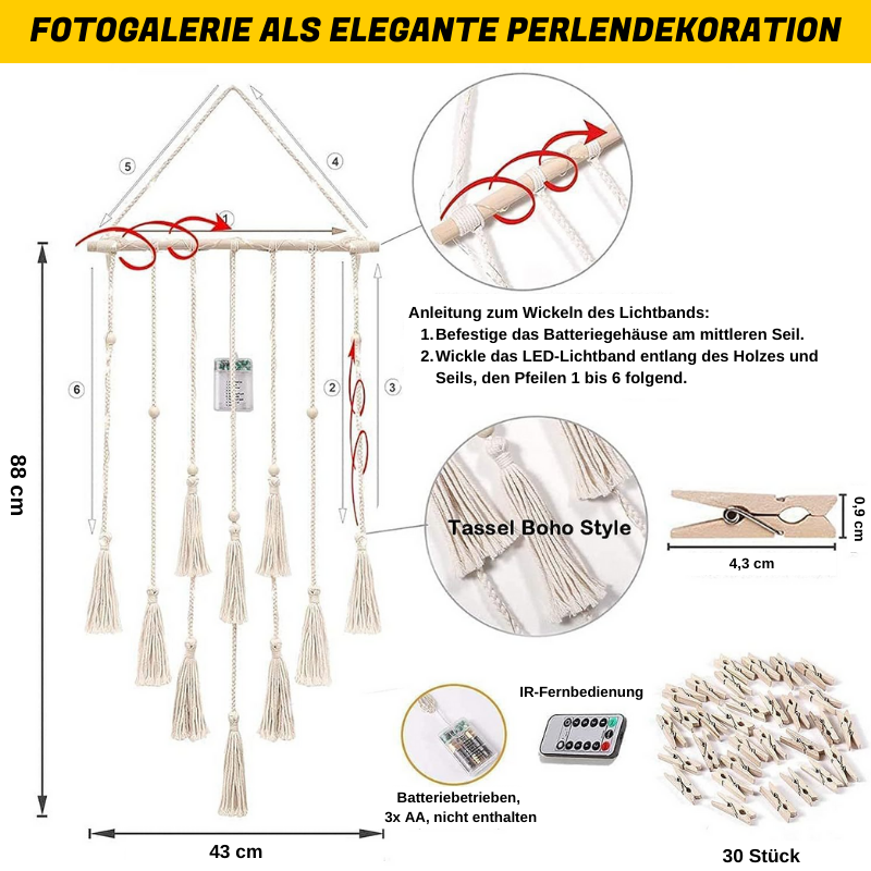Die Boho LED-Fotowand kombiniert ansprechendes Design mit praktischen Eigenschaften und ist ideal als individuelles Geschenk oder als stilvolle Dekoration für dein Zuhause. Diese Wandverzierung im charmanten Boho-Stil aus Holz und geflochtenem Baumwollseil bringt ein Gefühl von Eleganz und Behaglichkeit in dein Wohnumfeld. Besonders während der Weihnachtszeit oder als originelles Hochzeitsgeschenk ist sie ein hervorragender Blickfang.