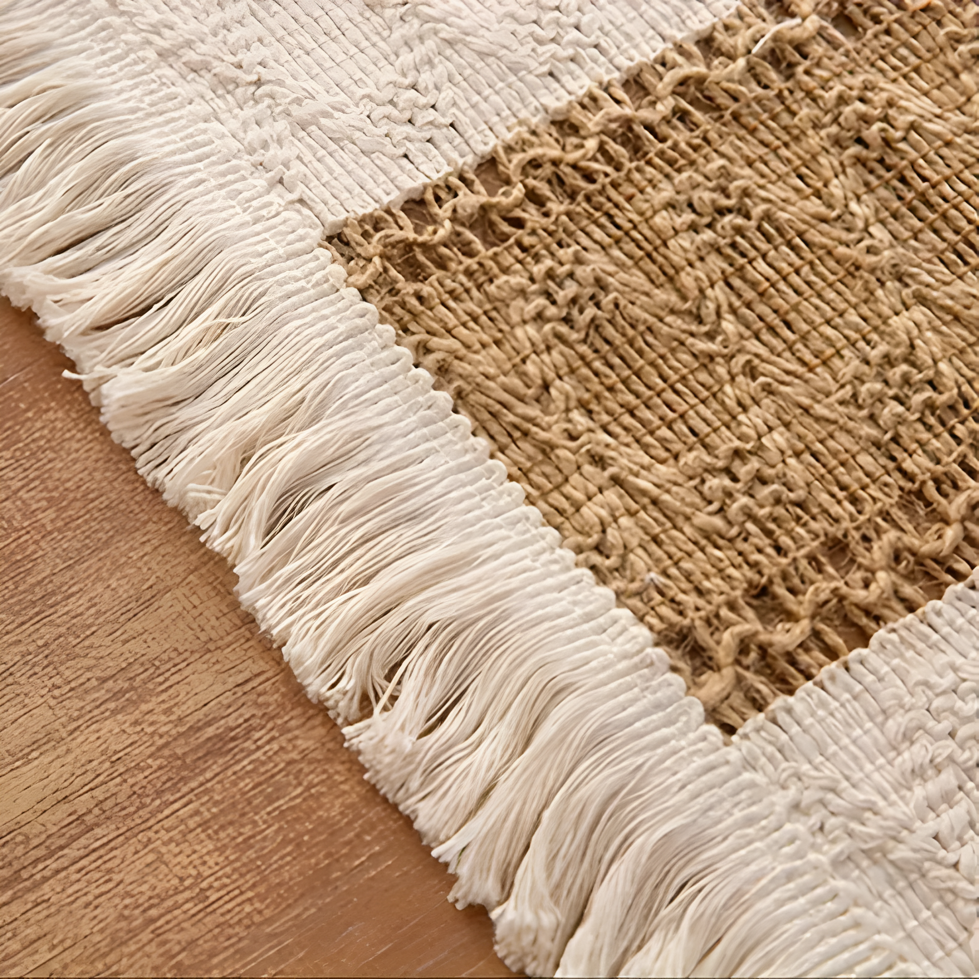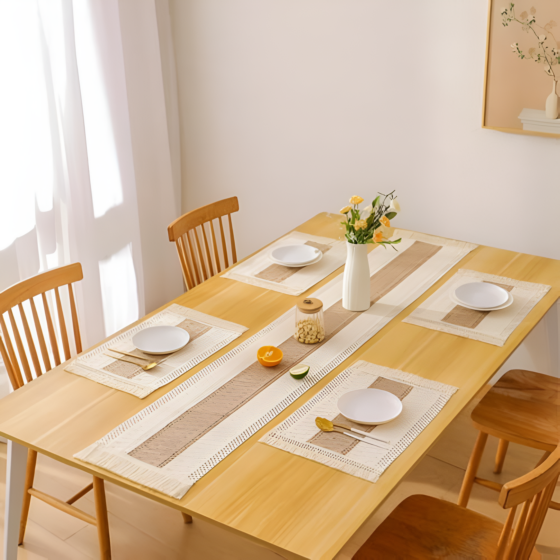 Verleihen Sie Ihren Tischdekorationen mit den Boho Stil Tischunterlagen einen besonderen Akzent. Sie bestehen aus einer Mischung aus Creme- und Jute-Tönen mit aufwendigen gewebten Streifen und Fransen und verleihen jedem Ess- oder Wohnraum eine rustikale, aber elegante Note. Perfekt für den täglichen Gebrauch oder für besondere Anlässe.