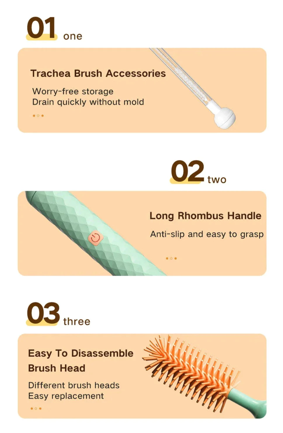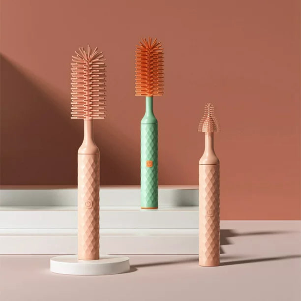 Schluss mit dem Schrubben und Einweichen! BottleSpark™ ist mit einer leistungsstarken, aber sanften Silikonbürste ausgestattet, die mühelos hartnäckige Rückstände, Milchflecken und schädliche Bakterien von den Flaschen Ihres Babys entfernt. Der 360° drehbare Bürstenkopf erreicht jeden Winkel und Spalt und sorgt für eine Reinigung, die mit der Hand nicht möglich ist.
