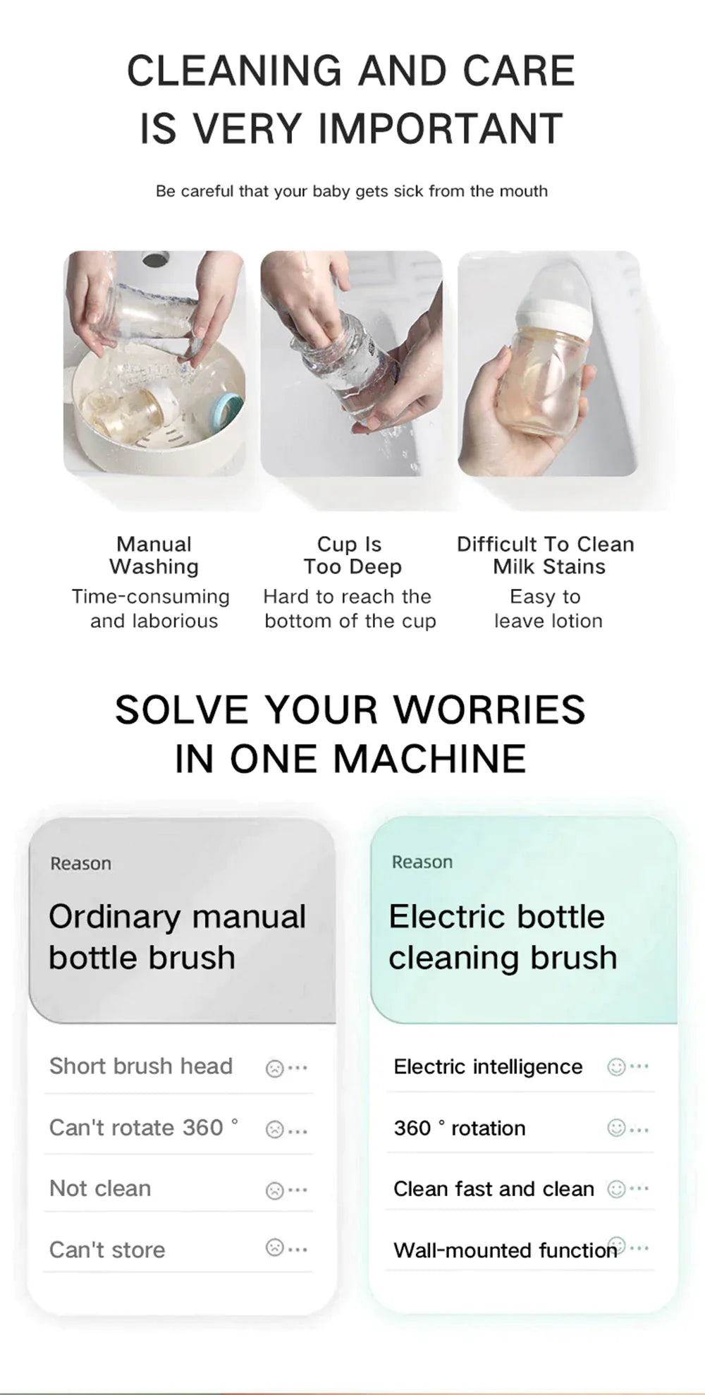 Eine saubere und hygienische Umgebung bei der Fütterung Ihres Babys ist unerlässlich, und BottleSpark™ hilft Ihnen, das zu erreichen. Es entfernt hartnäckige Rückstände und gefährliche Bakterien und bietet Ihnen die Sicherheit, dass die Flaschen Ihres Babys gründlich gereinigt und bereit für den nächsten Einsatz sind.