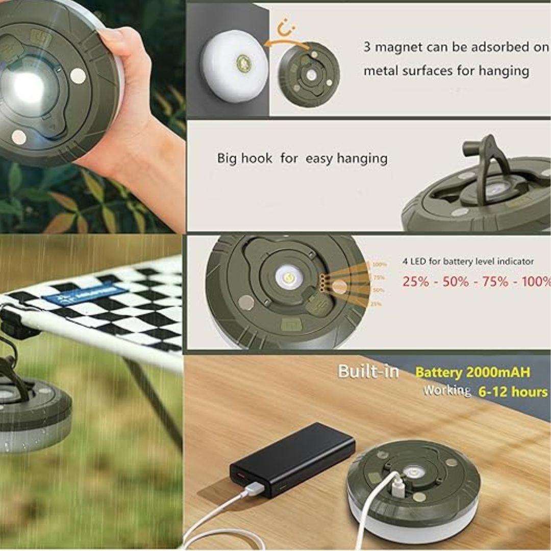 Lange Arbeitszeit + USB-Ladung: Ausgestattet mit einem integrierten, wiederaufladbaren 2000mAh Akku, bietet dieses tragbare Lichterkettenlicht 6 bis 12 Stunden durchgehendes Licht, abhängig vom gewählten Modus. Entworfen mit einem USB Typ-C-Anschluss für Ein- und Ausgangsladung kann das Licht externe Geräte wie Telefone, Kopfhörer und andere wichtige Ausrüstungen aufladen, während es Ihren Campingplatz beleuchtet. Die vier Energieanzeigen sorgen dafür, dass Sie den Ladezustand überwachen und bei Bedarf aufladen können, was sowohl Bequemlichkeit als auch Sicherheit bietet.