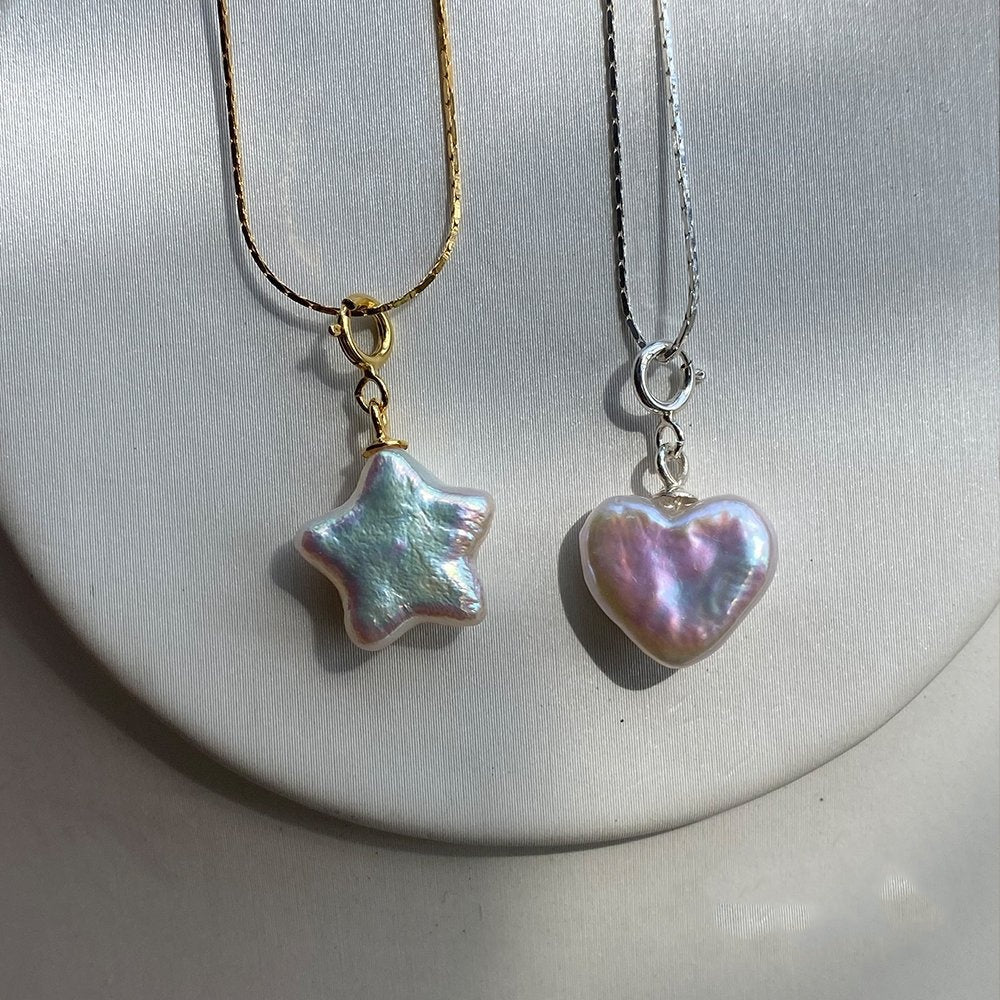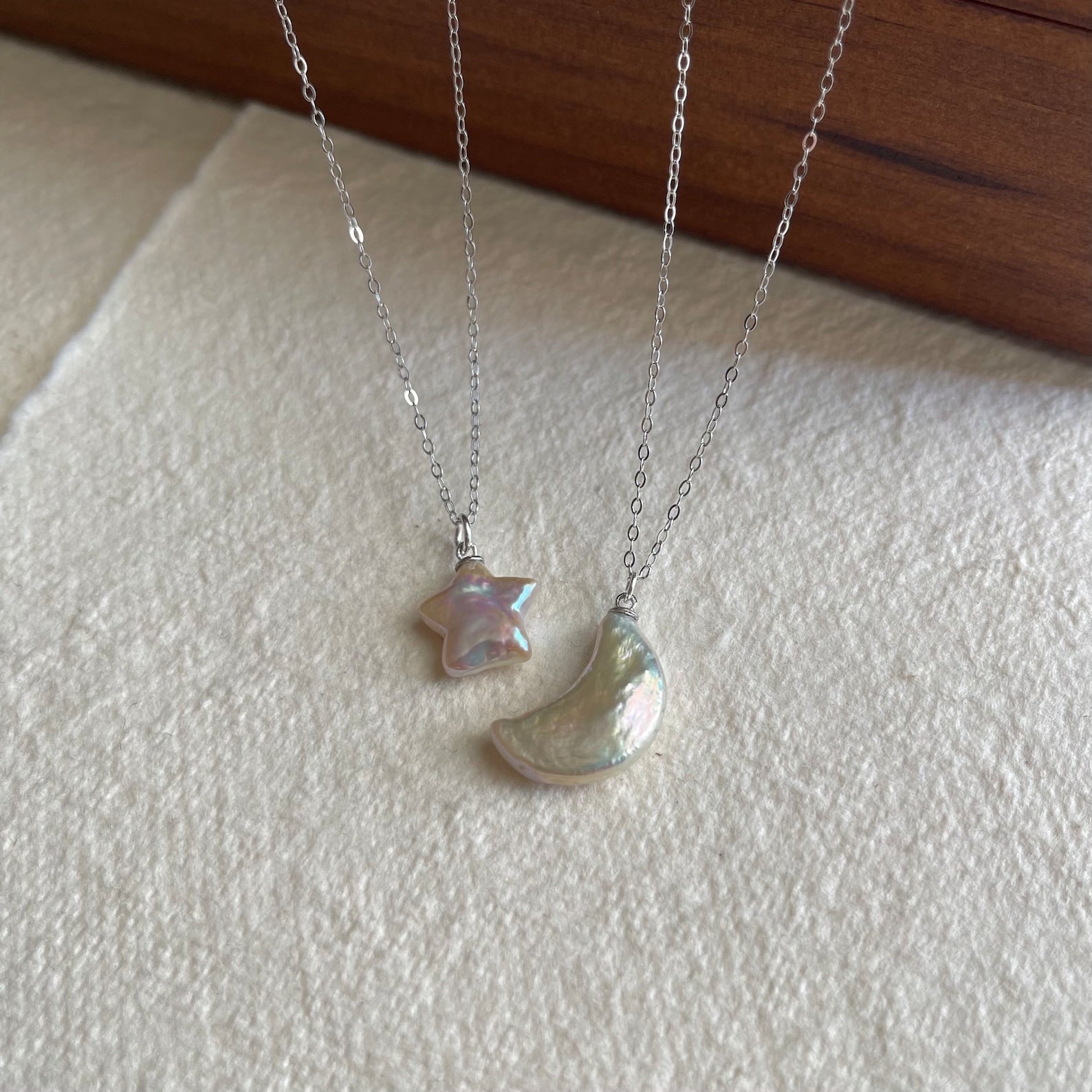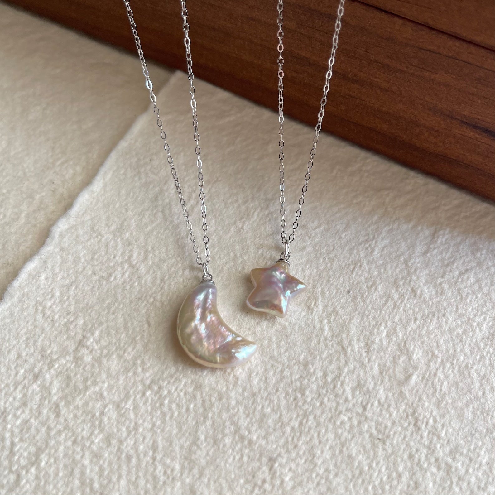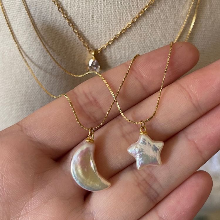 Die Perlen, Symbole der Reinheit und Weiblichkeit, verweben sich mit dem Mond und dem Stern, Symbolen von Traum und Hoffnung. Dieses Kollier ist eine Einladung, die Schönheit des Universums zu betrachten und Ihr eigenes inneres Licht erstrahlen zu lassen.