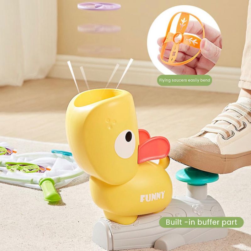 Unser Flying Disc Launcher Toy besteht aus hochwertigem ABS-Material, das äußerst langlebig und stoßfest ist. Es ist so stabil, dass auch Kinder mit beiden Füßen darauf stehen können. Zudem ist das Pedal mit einer Dämpfung versehen, um Verletzungen der Füße beim Spielen zu vermeiden.
