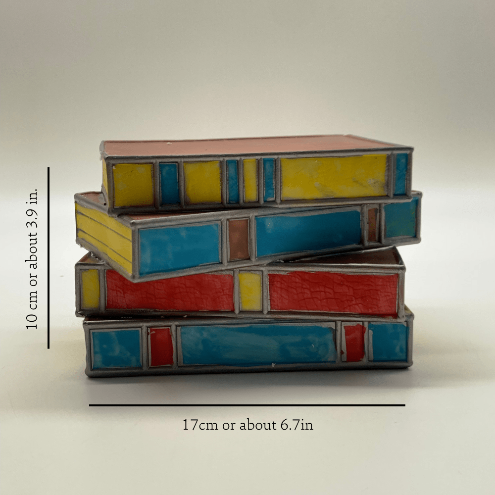 📚 Buch-inspiriertes Design – Ein fantasievoller Stapel Bücher, lebendig gemacht mit bunten Buntglasdetails.