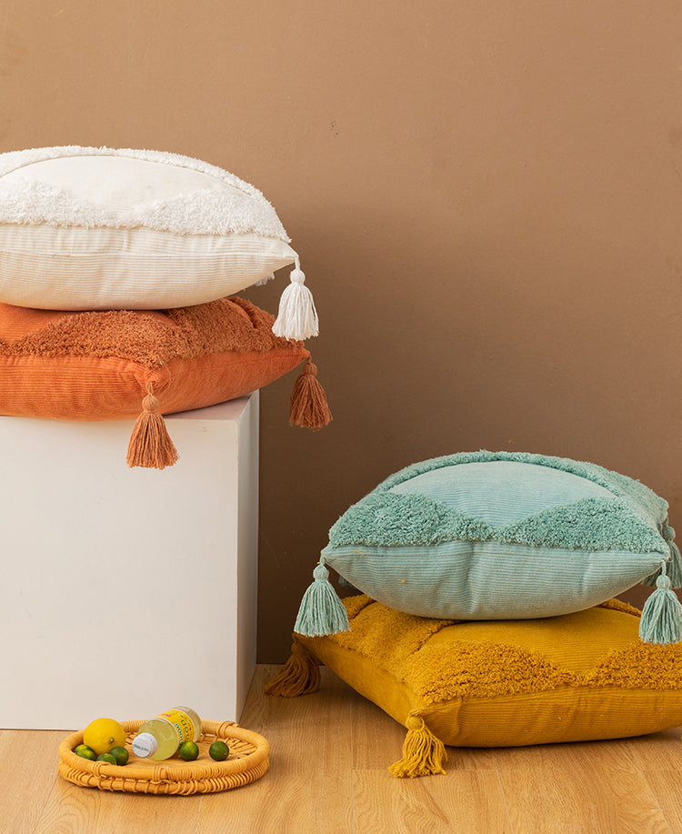 Handgemachter Kissenbezug aus Baumwoll-Cord – Geometrisches Design – Mit Quasten und Reißverschluss