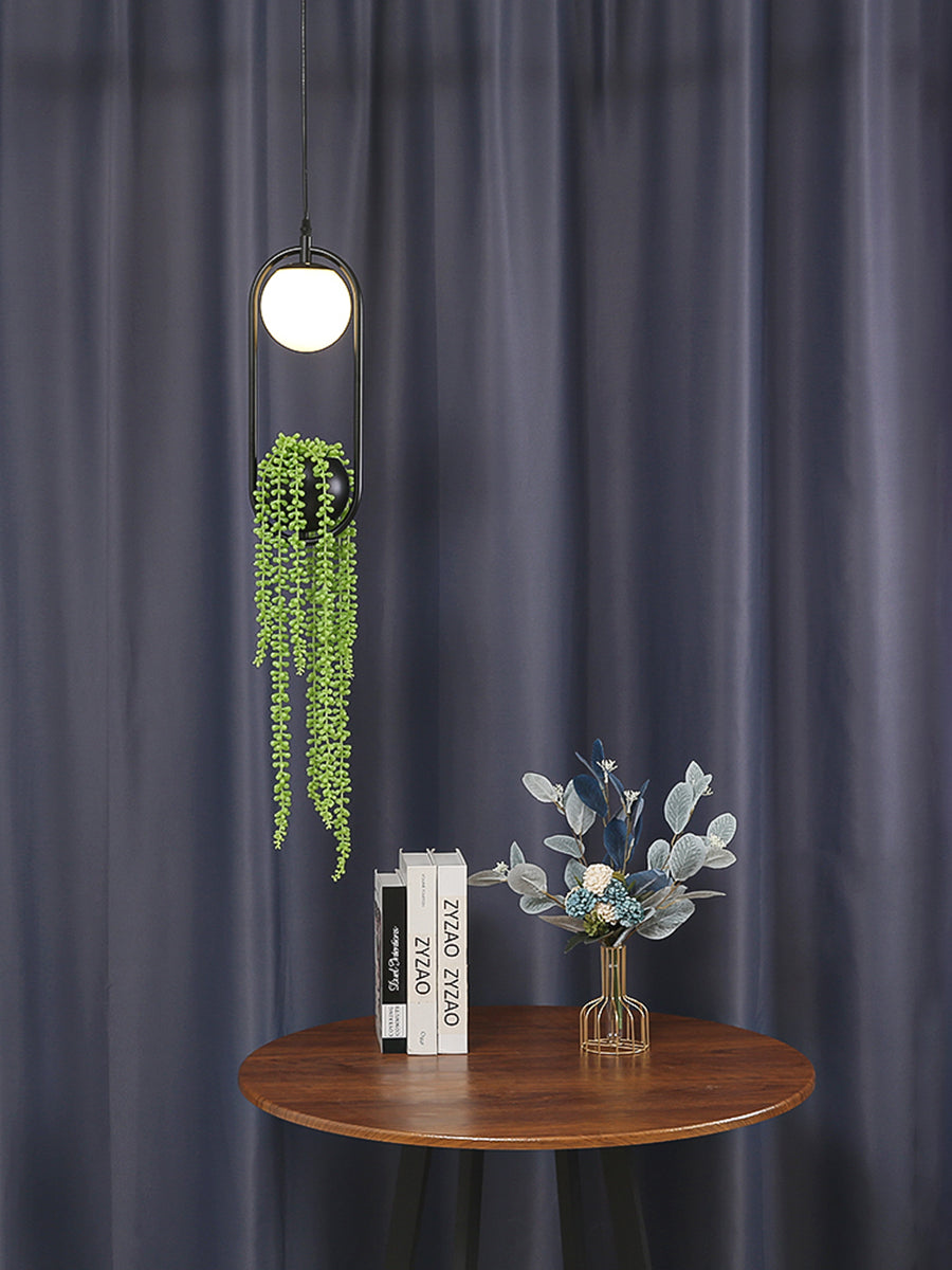 Hängendes Pflanzgefäß mit Hängeleuchte – Schwarzes Metall – Aus Frosted Glass & Künstlichen Pflanzen
