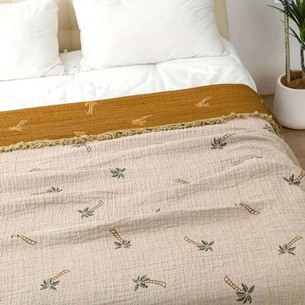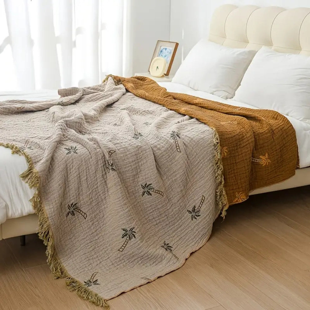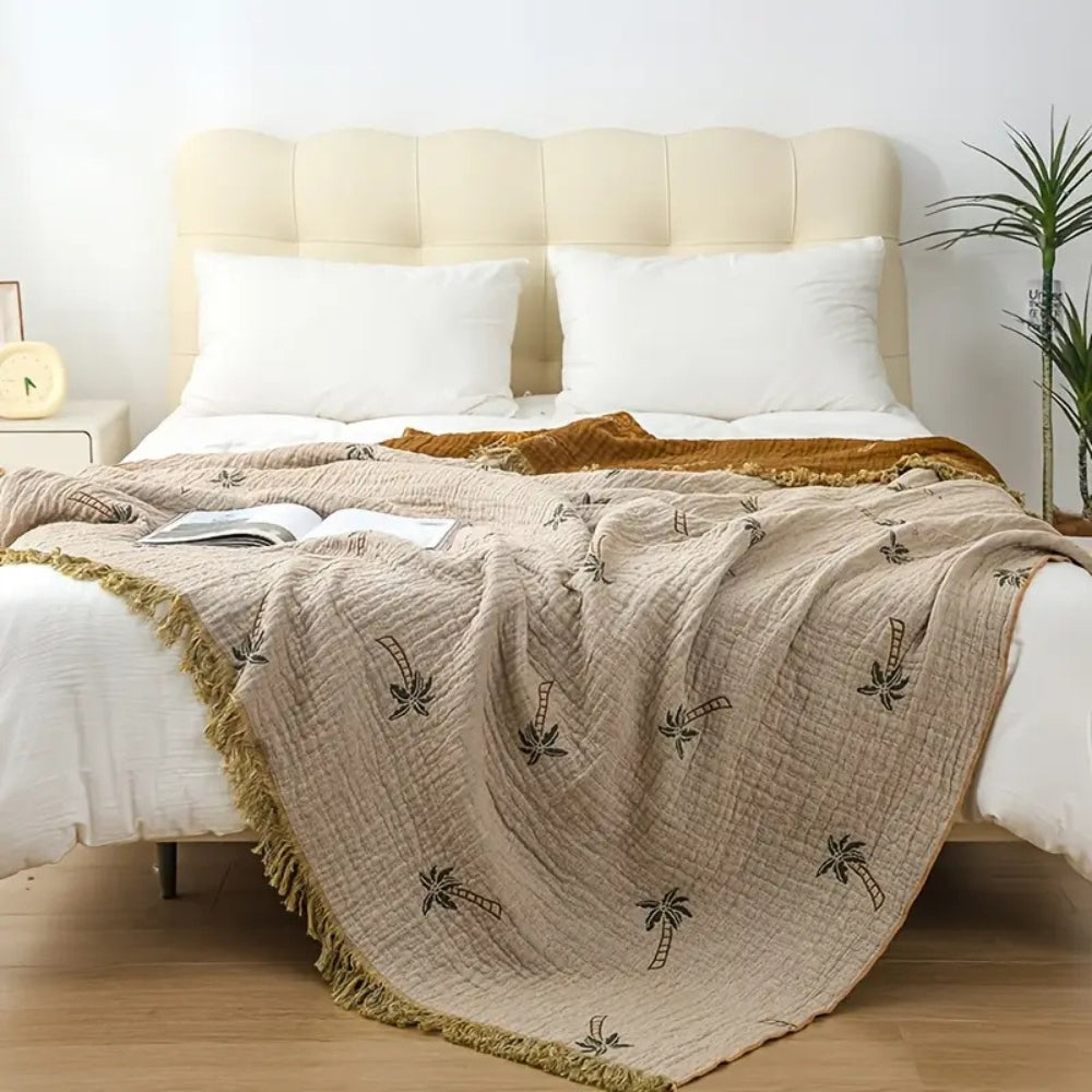 Verwandeln Sie Ihren Raum mit der Island Escape Kokosnussbaum Quastendecke. Entworfen mit filigranen Kokosnussbaum-Mustern und aus 100% feiner Baumwolle gefertigt, bietet diese wendbare Decke einen Hauch tropischer Eleganz. Perfekt für Sofas, Betten oder sogar als Sofatuch, bietet sie ganzjährigen Komfort und hebt jeden Raum mit ihrem erfrischenden, insel-inspirierten Thema hervor.