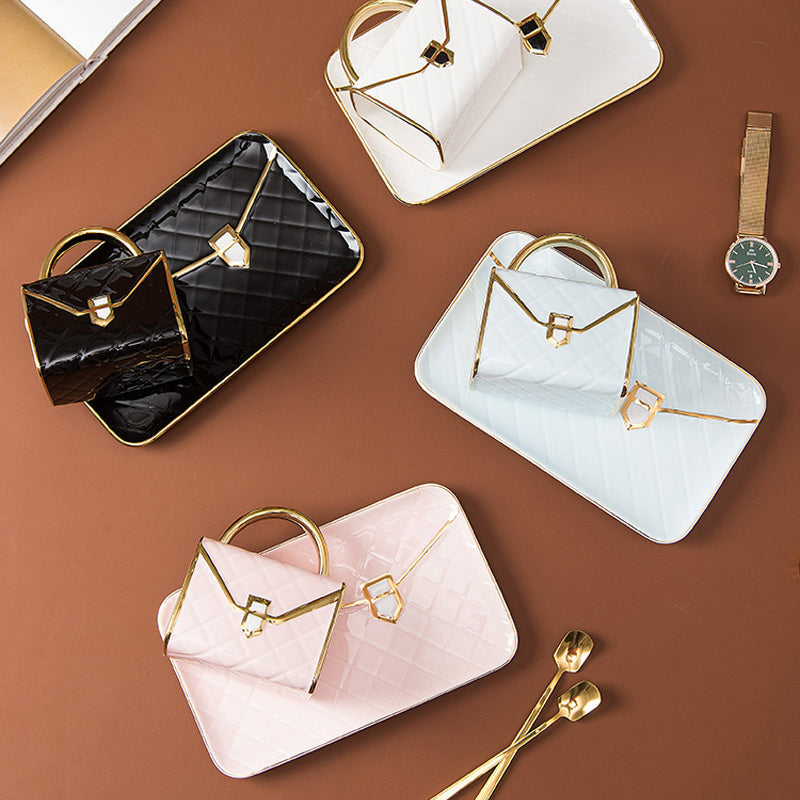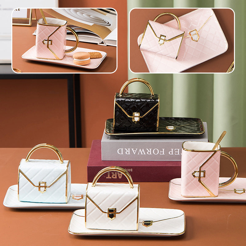 Außergewöhnliche Handtaschen-Diner-Tasse für Damen mit Tablett und Löffel