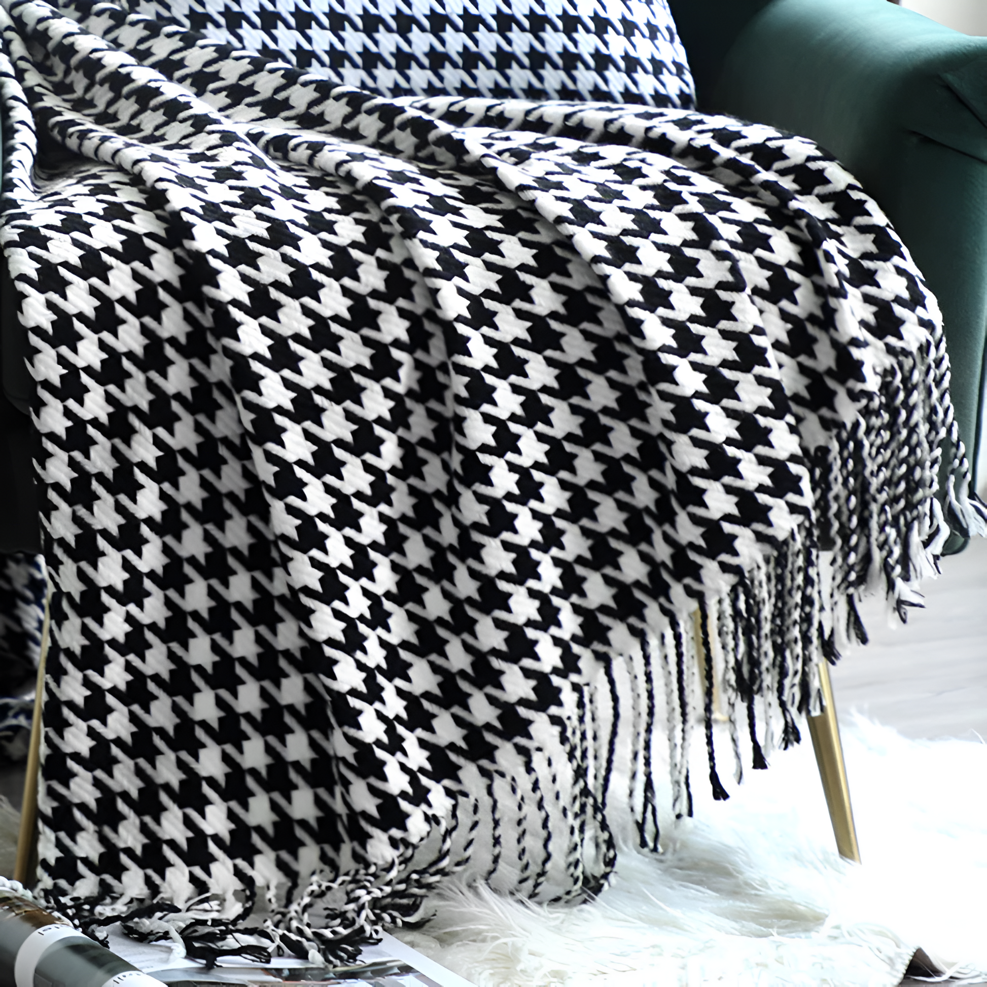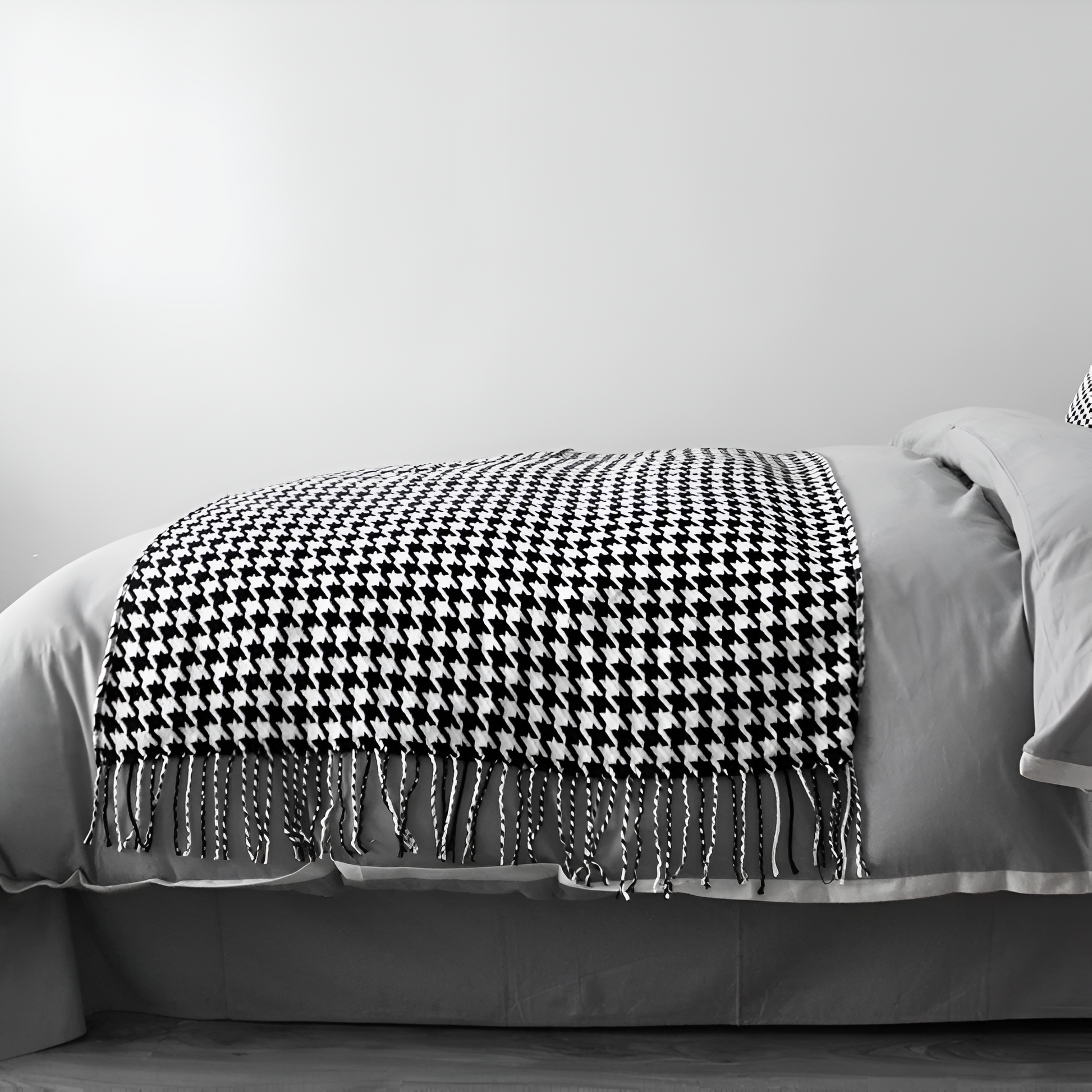 Hüllen Sie sich in Komfort und Eleganz mit der klassischen Hahnentrittmusterdecke. Mit einem schlichten Schwarz-Weiß-Hahnentrittdesign und weichem synthetischem Wollgefühl ist diese Decke perfekt für kalte Abende, stilvolle Dekoration oder als durchdachtes Geschenk.