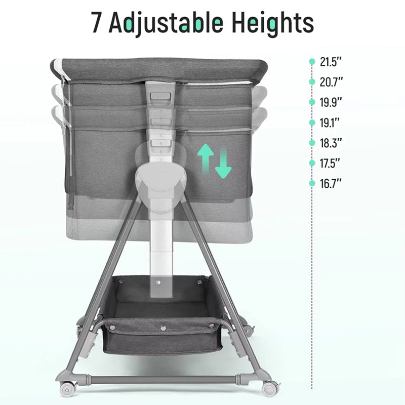 Unser Beistell-Bassinet bietet 7 verstellbare Höhenstufen, wodurch das Baby-Bassinet perfekt an Ihr Bett angepasst werden kann, um eine nahtlose nächtliche Pflege zu gewährleisten. Das Design ohne Lücken von 99% sorgt dafür, dass Sie Ihr Baby mit einem kurzen Blick im Auge behalten können, was für Seelenfrieden und Sicherheit sorgt. Dieses Merkmal macht es zum besten Bassinet für das Co-Sleeping, egal ob Sie zu Hause sind oder ein transportables Bassinet für Reisen benötigen, es ist das beste Reise-Bassinet für Eltern, die Bequemlichkeit und Komfort wünschen.