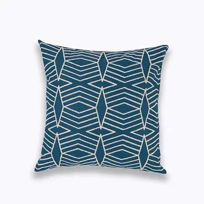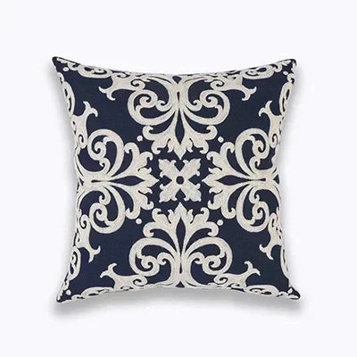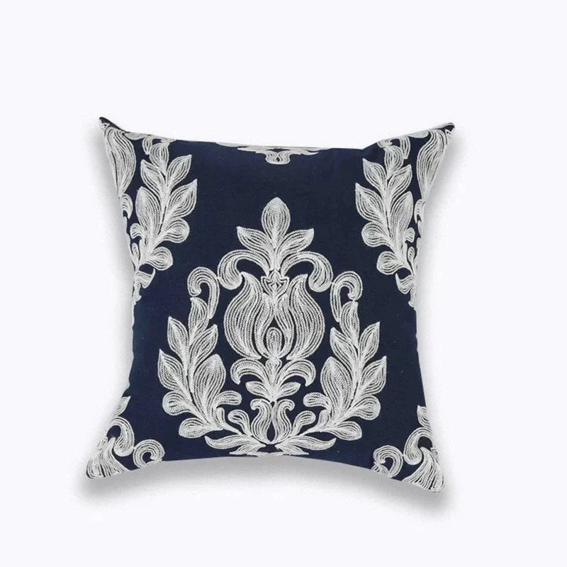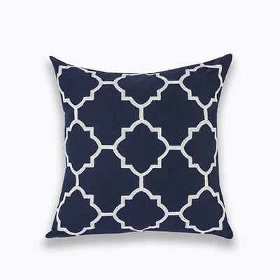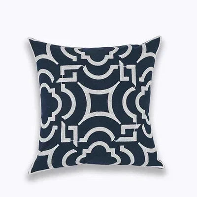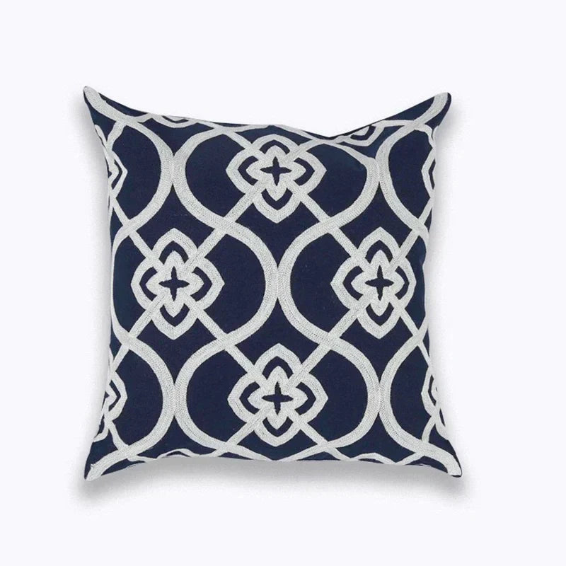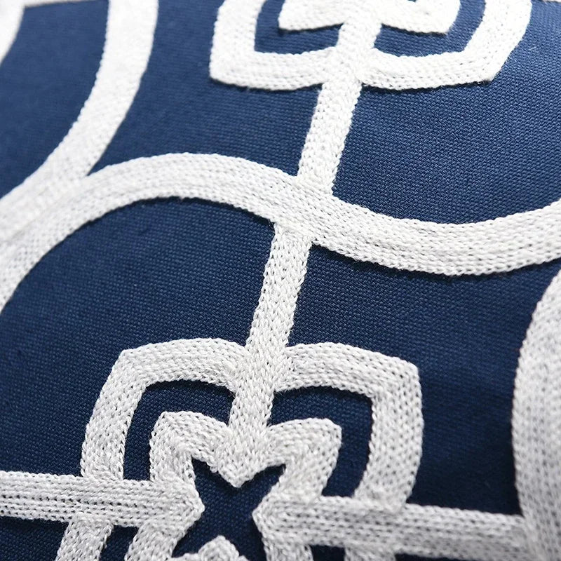 Bereichern Sie Ihr Interieur mit der eleganten NovaLuxe Stickkissenhülle. Diese luxuriöse Kissenhülle von 45x45 cm vereint raffinierte Handwerkskunst mit zeitlosem Stil. Das geometrische Vierpassmuster, kunstvoll in tiefem Marineblau und strahlendem Weiß bestickt, verleiht jedem Raum einen Hauch von Klasse.