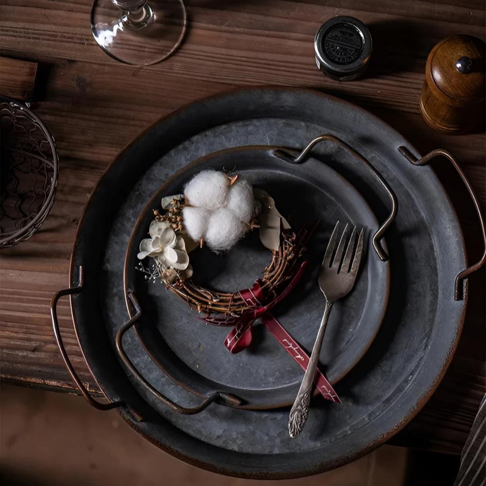 Erheben Sie jede Mahlzeit mit dem zeitlosen Charme der Retro Runde Metall Serviertabletts. Entworfen mit komplizierten Mustern und rustikalen Akzenten, vereinen diese Tabletts Praktikabilität mit klassischer Eleganz. Hergestellt aus massivem, distressed Eisen, sind sie ideal zum Servieren, Styling oder um einen Hauch von vintage Sophistication zu jeder Gelegenheit oder jedem Raum hinzuzufügen.