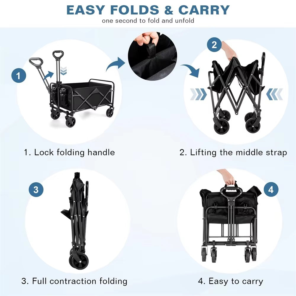 Unser faltbarer Wagen ist mit einem stabilen Stahlrahmen und Geländereifen für mühelosen Transport ausgestattet. Sein faltbares Design ermöglicht eine schnelle Einrichtung und einfaches Falten für kompakte Lagerung.
