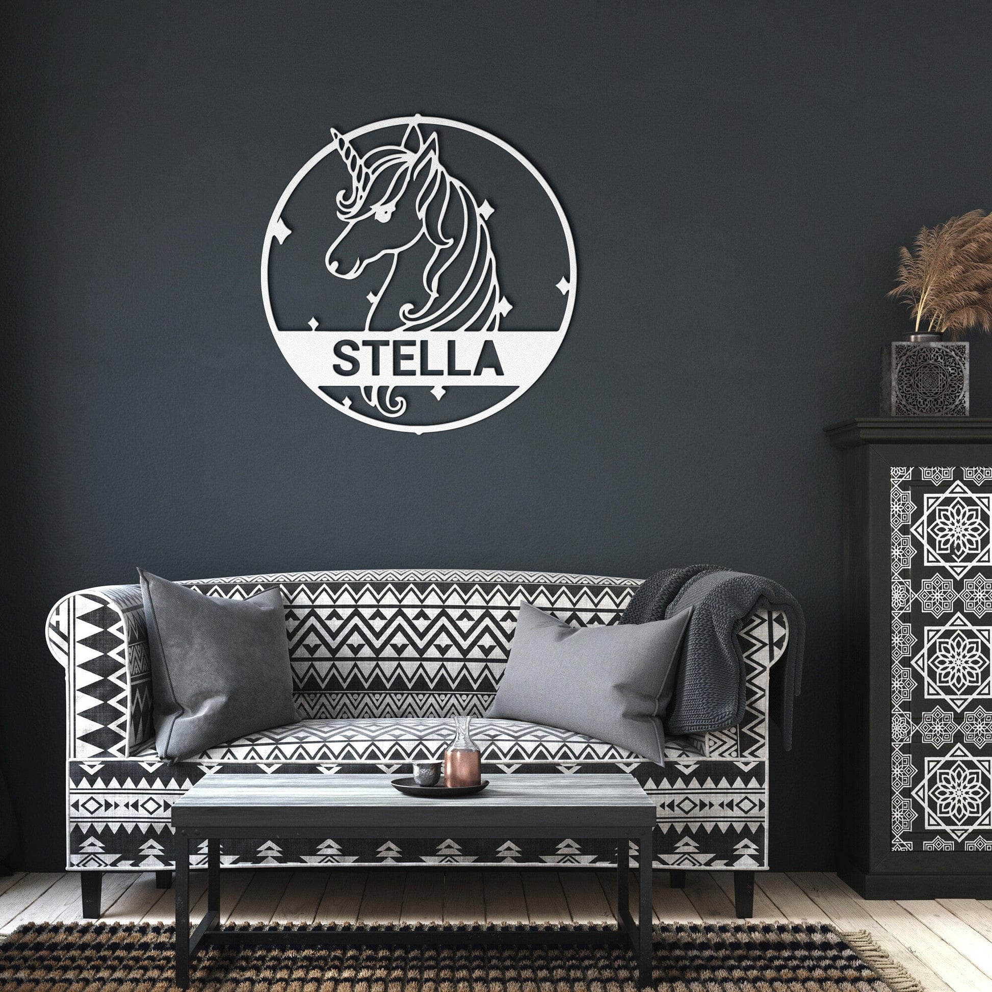 Dies ist das perfekte Geschenk für Ihre kleine Tochter oder Enkelin. Passen Sie diese einzigartige Einhorn-Wandkunst mit dem Namen Ihres Mädchens oder einem anderen Namen an. Sie wird an der Wand hängen und immer einen Blick darauf haben, während sie schläft. Alle bösen Monster unter dem Bett werden fernbleiben und sie wird einen tollen Schlaf haben.