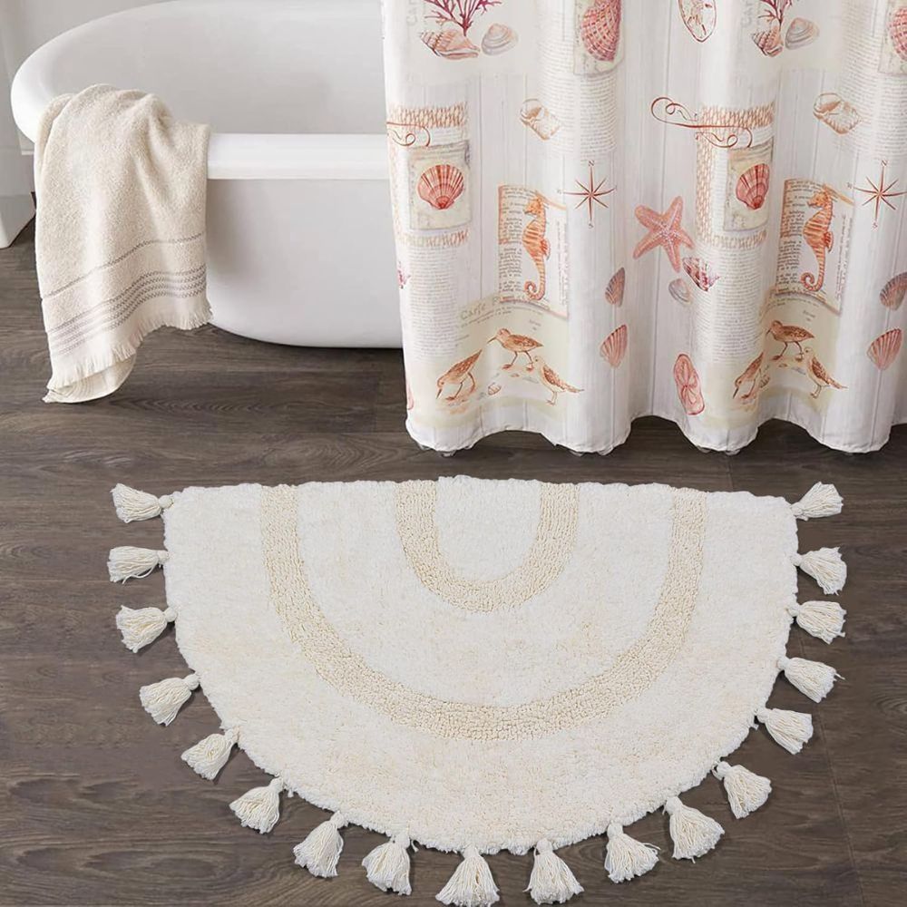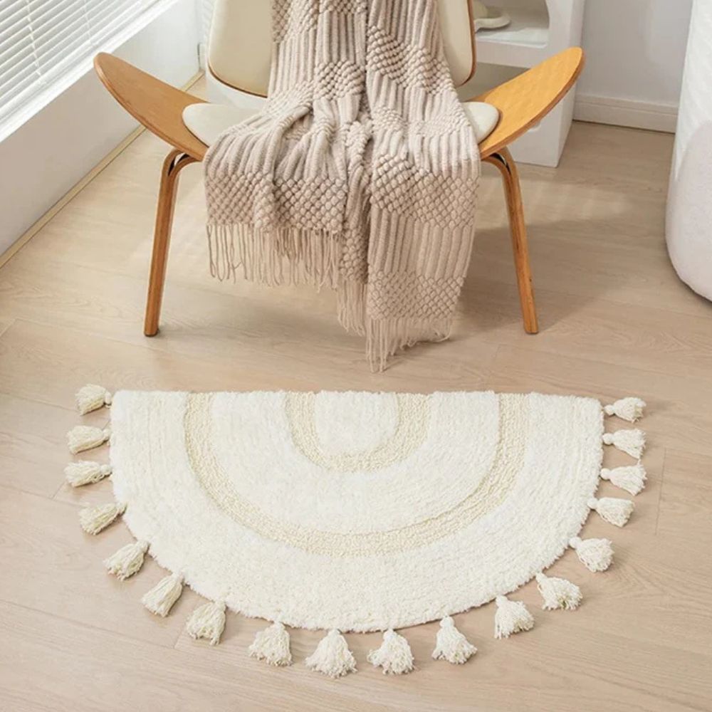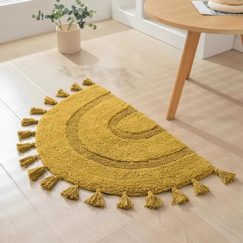 Der Sunrise Arch Tassel Mat bringt Wärme, Textur und bohemian Charme in Ihr Zuhause. Hergestellt aus 100% Baumwolle, verfügt dieser halbkreisförmige Teppich über schöne Fransen und ein von Bögen inspiriertes Design. Weich, saugfähig und stilvoll hält er Ihre Füße in jedem Raum trocken, warm und gemütlich.