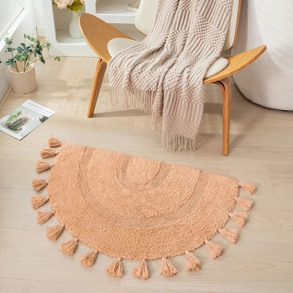 - Halbkreisförmiger Bohemian-Teppich mit Bogenverzierungen und handgewebten Fransen