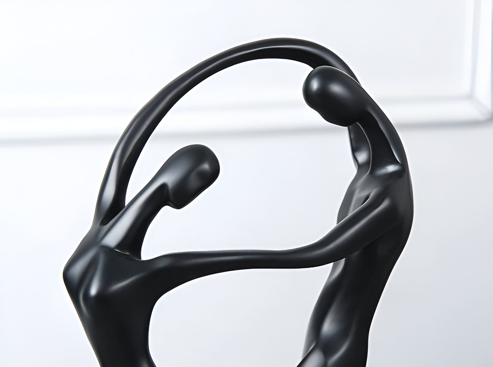 Sind Sie bereit, Ihren Lebensraum in eine Galerie der Eleganz und der Emotionen zu verwandeln? Treffen Sie SwayDuo Ornament! Die aus Kunstharz gefertigte Skulptur zeigt eine schwarze Figur, die kraftvolle Linien und Kurven ausstrahlt, und eine weiße Figur, die Anmut und Leichtigkeit ausstrahlt. Die fließenden Linien und die kontrastierenden Farben schaffen ein dynamisches Bild, das jedem Raum Leben einhaucht.