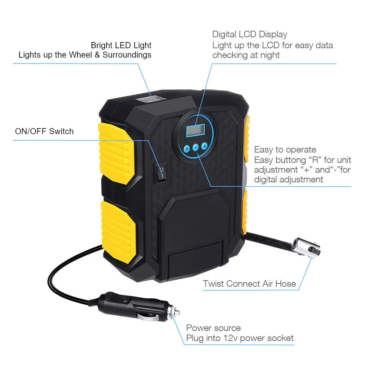 - Digitales Display: Stellen Sie den gewünschten Druck ein, und der Kompressor schaltet sich automatisch ab, sobald der Druck erreicht ist.