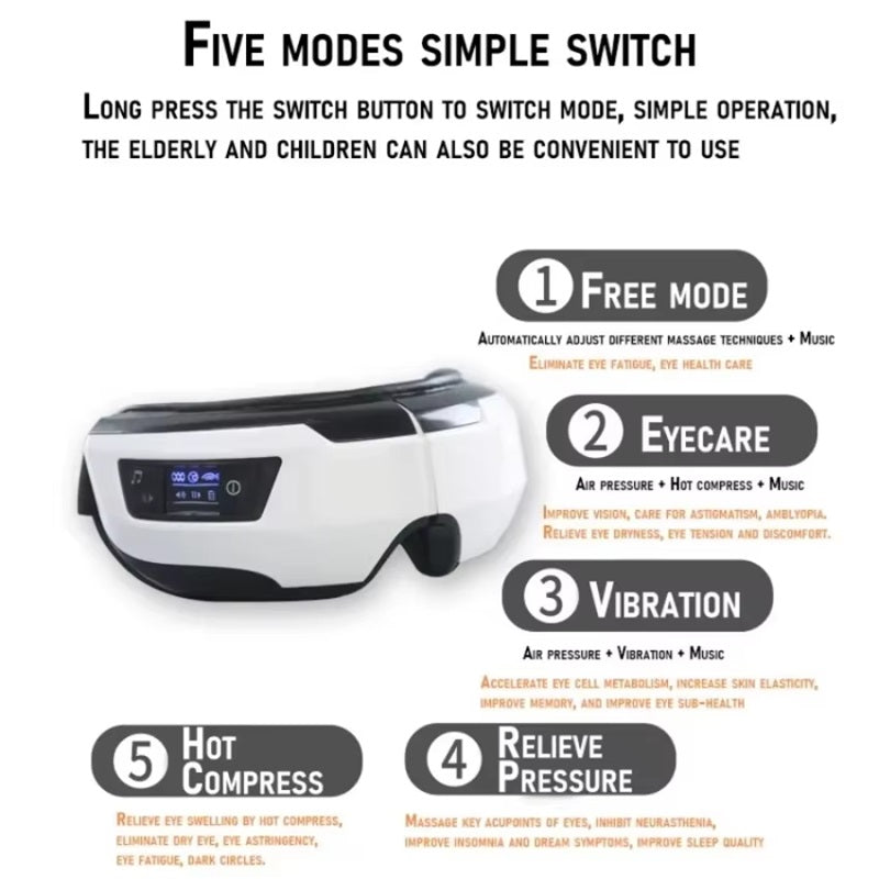 Unser Augenmassagegerät funktioniert, indem es Luftdruck, Vibration und Wärme verwendet, um die Bereiche um Ihre Augen zu massieren und Müdigkeit und Spannung zu lindern.