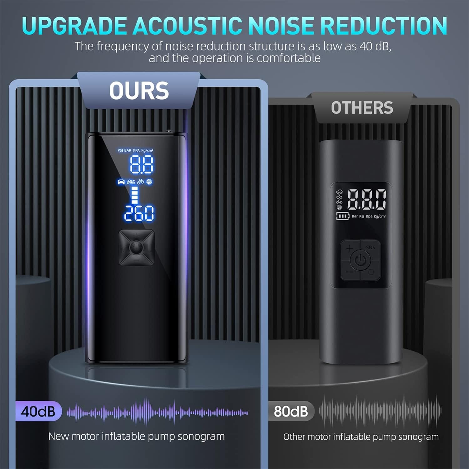 Mit unserem tragbaren Auto-Luftkompressor können Sie sich bei jedem Pumpvorgang auf präzise Druckmessungen verlassen. Kein Rätselraten oder Unsicherheit mehr; das digitale Display und die benutzerfreundliche Einstell- und Stop-Funktion geben Ihnen die vollständige Kontrolle über den PSI Ihrer Reifen und sorgen dafür, dass sie jedes Mal perfekt aufgepumpt werden. Vergessen Sie die Sorge um Über- oder Unteraufpumpen – die Genauigkeit unseres Aufpumpens stellt sicher, dass Ihre Reifen immer auf ihrem optimalen Druck sind, für eine sicherere und effizientere Fahrt.