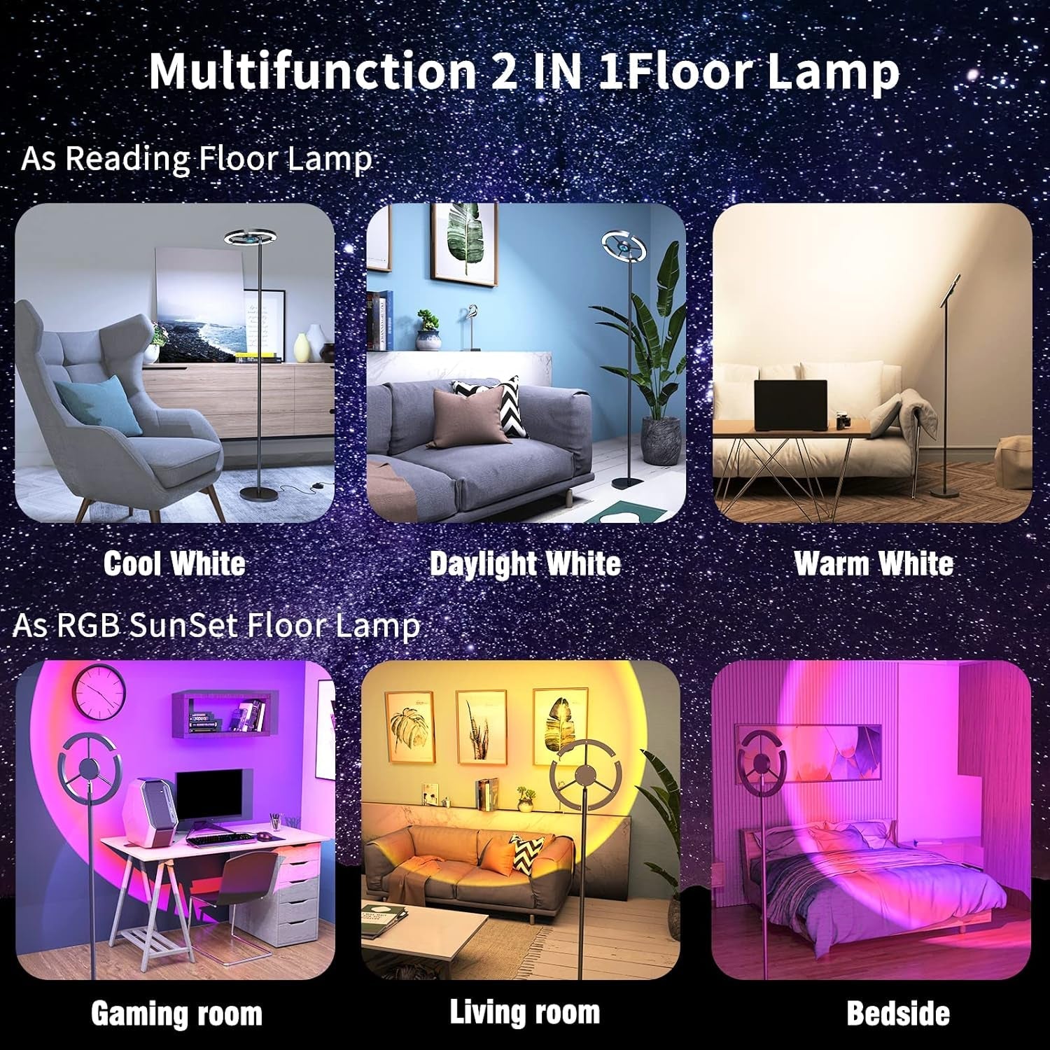 Verbessern Sie die Atmosphäre Ihres Zuhauses mit der 3-in-1 Sonnenunterganglampe, einer multifunktionalen Stehlampe, die atemberaubende Lichteffekte erzeugt. Mit einer 360°-Drehung, 16 lebhaften Farboptionen und einstellbaren Farbtemperaturen verleiht diese Lampe jedem Raum einen Hauch von Magie. Egal, ob Sie die Stimmung für einen gemütlichen Abend setzen, Ihre Wohnzimmerdekoration aufpeppen oder bei besonderen Anlässen eine festliche Stimmung schaffen möchten, diese Lampe ist eine vielseitige und stylische Lichtlösung.