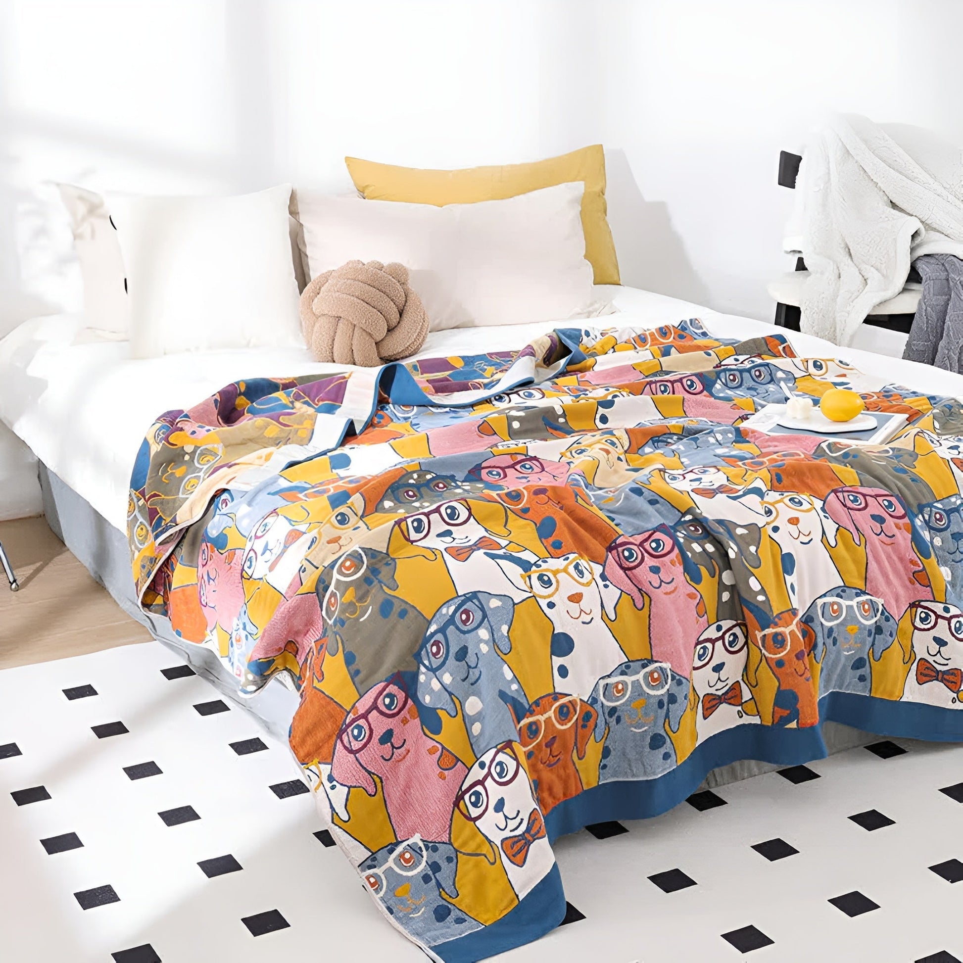 Hüllen Sie sich in den Charme der verspielten Hundedruck-Baumwolldecke. Hergestellt aus hochwertigem Baumwollgaze, bietet diese weiche und atmungsaktive Decke außergewöhnlichen Komfort für eine erholsame Nachtruhe. Verziert mit lebhaften Hundedrucken bringt sie einen Hauch von Spaß in jedes Schlafzimmer oder jeden Wohnraum.