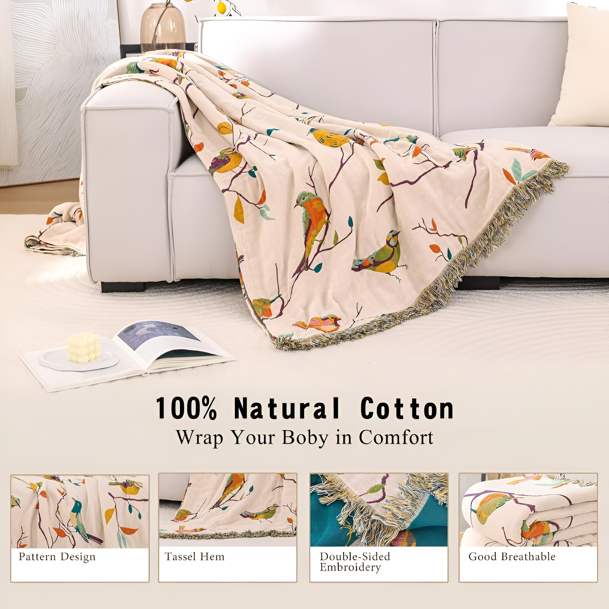Fügen Sie Ihrem Zuhause mit unserer Verspielten Vogel Quasten Baumwolldecke eine stilvolle Schicht Wärme hinzu. Hergestellt aus 100% Baumwolle, ist diese Boho-Decke atmungsaktiv, leicht und gemütlich, mit einem lebhaften Vogeldesign mit Fransen für einen Vintage-Touch. Perfekt als Bett-, Sofa- oder Picknickdecke, ist sie langlebig und stilvoll und macht sie zu einem idealen Geschenk für jeden Anlass.