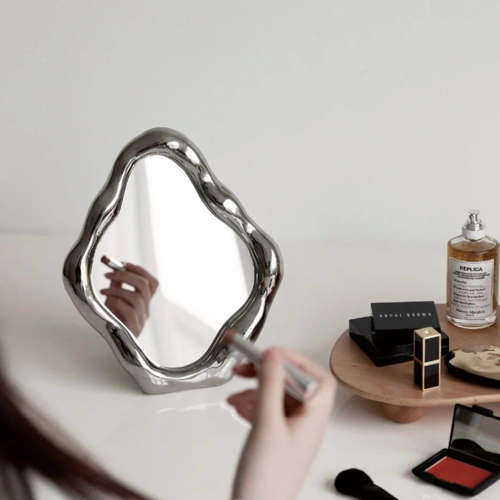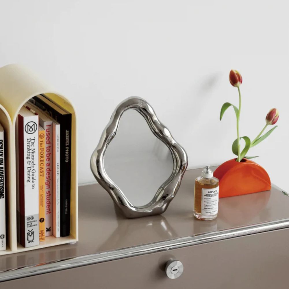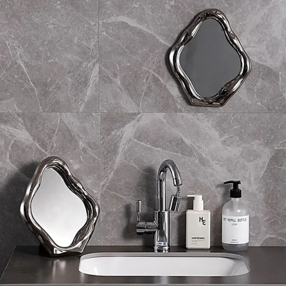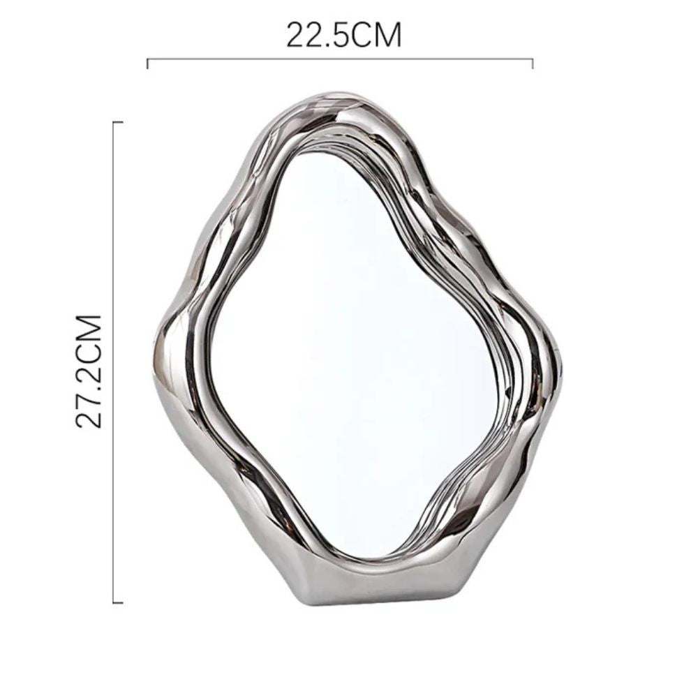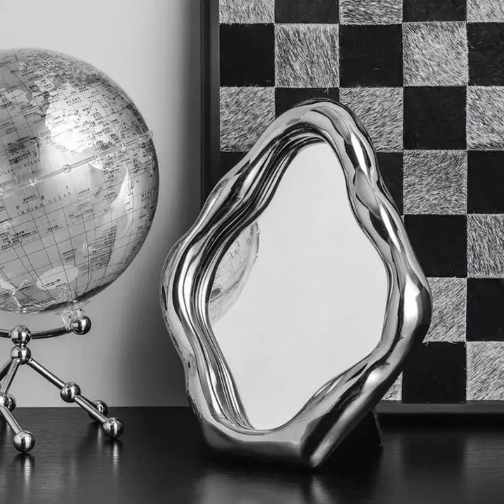 Verleihen Sie Ihrer Einrichtung mit dem Wave Sculptural Tischspiegel einen modernen Touch. Mit einem unregelmäßigen Design und einem eleganten silbernen Rahmen feiert dieser handgefertigte Spiegel natürliche Unvollkommenheit und setzt gleichzeitig ein gewagtes, künstlerisches Statement.